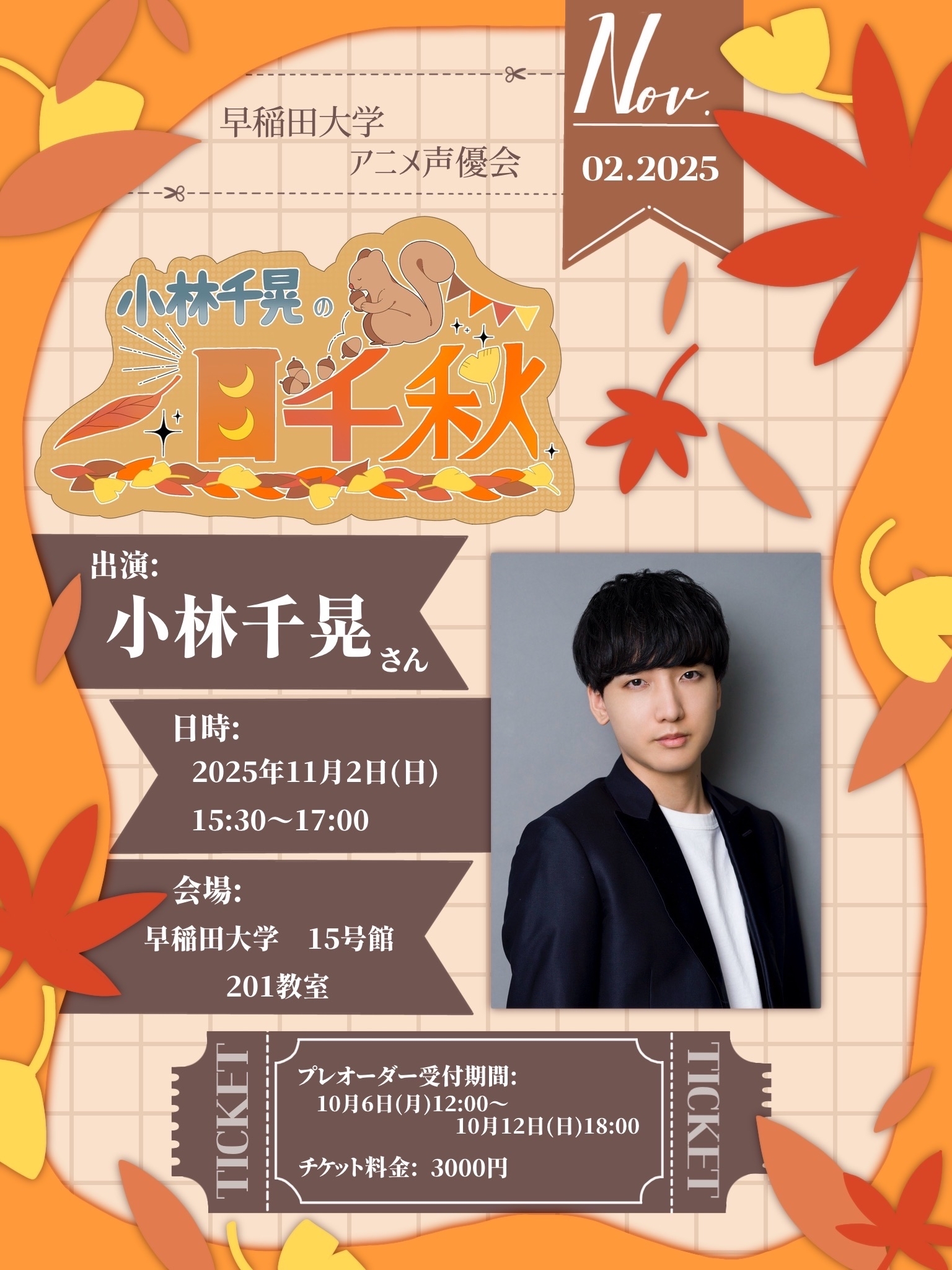 本年度の早稲田祭2日目では、『マッシュル -MASHLE-』のマッシュ・バーンデッド役や『光が死んだ夏』の辻中佳紀役など、数々の話題作にご出演されている小林千晃さんをお招きし、トークイベントを開催いたします!